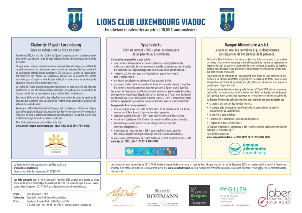 La liste complète des gagnants sera publiée sur www.lionsclubviaduc.lu. Autorisation Ville de Luxembourg N° 53/2025/5.
