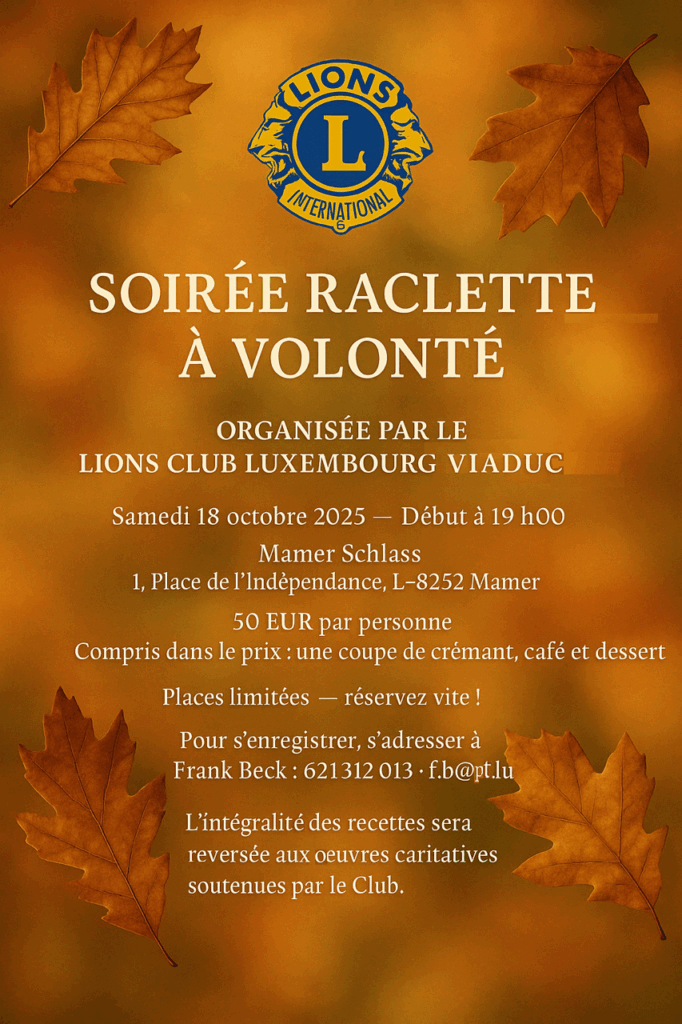 Le Lions Club Luxembourg Viaduc a l’honneur et le plaisir de vous inviter cordialement à notre Soirée Raclette qui aura lieu le 18 octobre 2025 au Mamer Schlass.